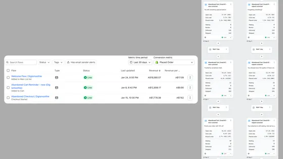 - Automated Flows - Up to 60% of email revenue comes from automation. We build Welcome flows, Abandoned Cart recovery, and other sequences that generate sales 24/7.