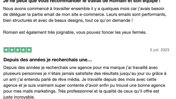 "40% de notre CA généré À l'heure où j'écris ce commentaire, ReveMedia représente 40% de notre CA généré ce mois-ci grâce l'emailing. C'est juste énorme ! C'est un plaisir de travailler avec Romain et toute son équipe ! Ils sont disponibles et les séquences sont de qualités. Si vous travaillez avec une agence qui prend 10% du CA généré par email, vous savez ce qu'il vous reste à faire ;) En travaillant avec ReveMedia, vous faites plus de bénéfices et d’économies en même temps ! Que demandez mieu"