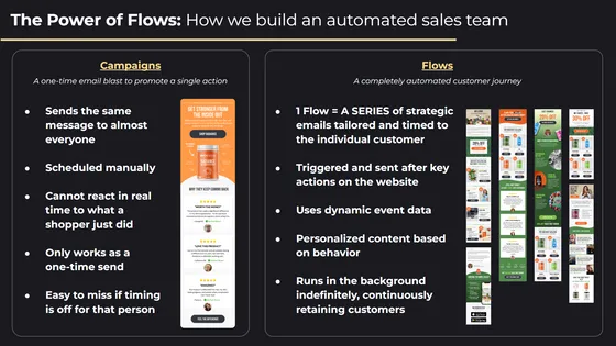 – Cart abandonment, win-back, welcome flows, post-purchase, loyalty, and churn prevention